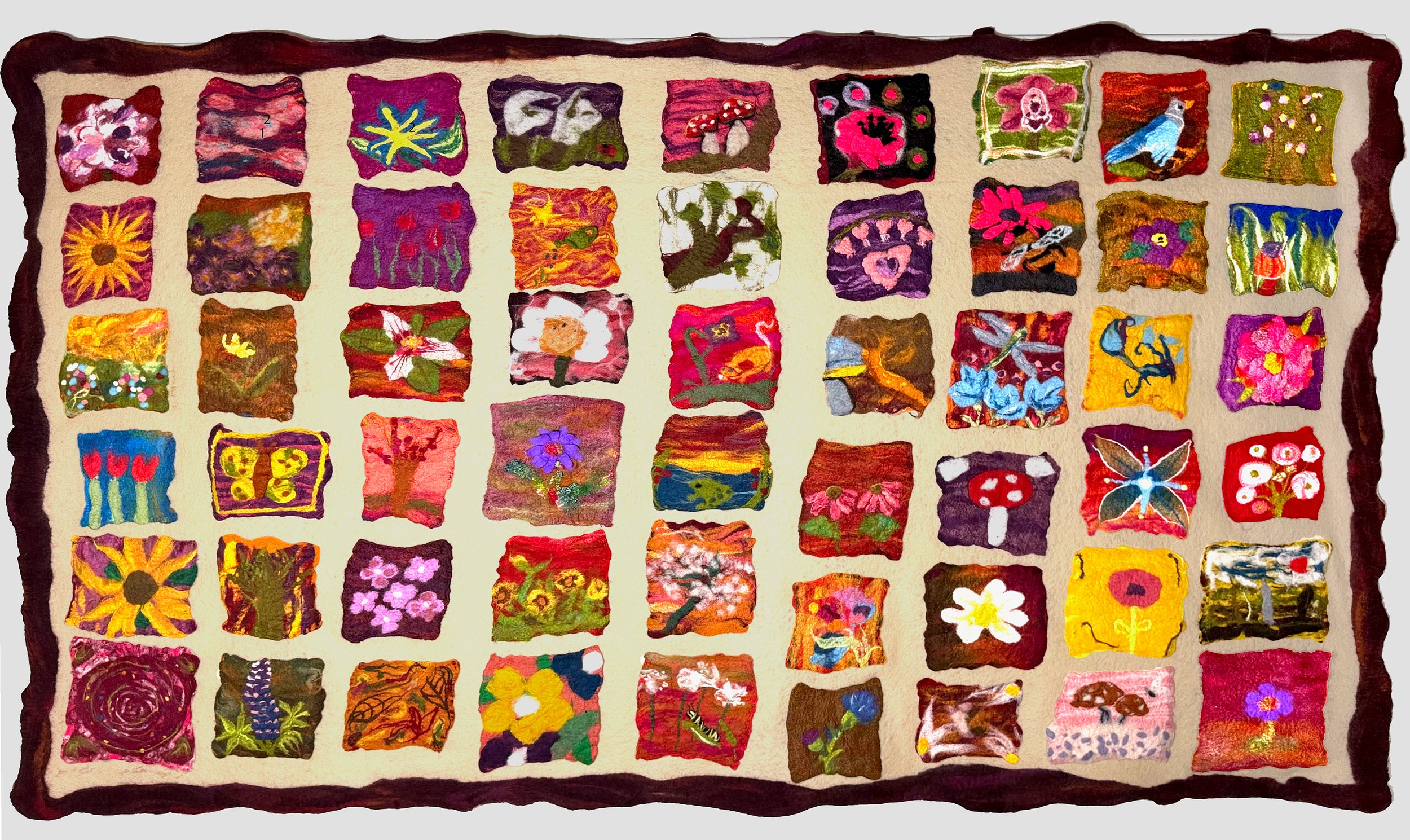 We will be displaying a 4ft by 7ft garden themed quilt that was assembled by the community using wet felting and needlepoint felting techniques and holds 55 uniquely designed pieces from community members.